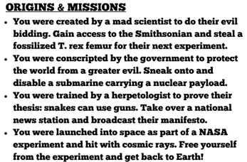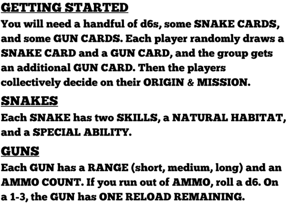 GUNSNAKES is a rules-lite one-page TTRPG complete with a set of printable GUN CARDS and SNAKE CARDS. Pick a MISSION/ORIGIN or make your own, then accomplish your goal with nothing more than your SKILLS and your GUN.