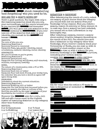 To play █████████, you will need d6s and a notetaking device - handwritten notes are encouraged for security purposes. A heavy permanent marker (with plenty of ink) is also recommended.