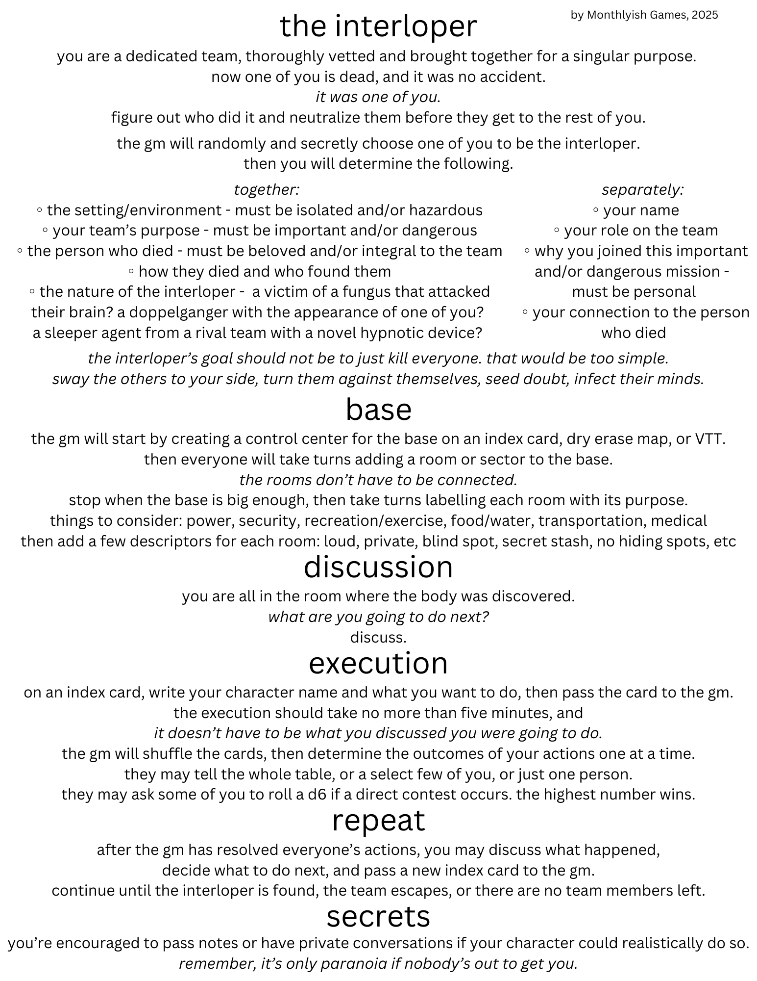 the interloper can be played in person with little more than a sheet of paper or dry-erase map and a stack of index cards. It's also well suited for online play where you can make breakout groups for people who go off on their own or in small groups - anywhere that private messaging is simple. You could even play just on your phones through text messaging.